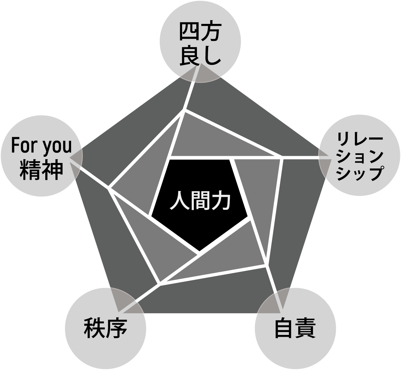 人間は、「与える事で豊かさを得る」という宇宙の法則である素晴らしい方程式を、世間の1人にでも多く広げるべく、当社は価値の三種の神器として、「四方良しの選択」・「For you精神」・「リレーションシップ」を掲げ、「やり方より在り方」に重みを置き、会社のメンバー全員がミッション、ビジョン、バリューに対し一丸となり、ワンチームで形成される組織を目指しています。